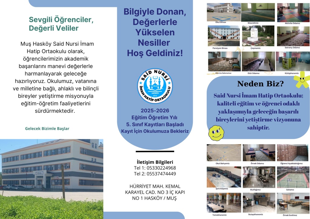 2025-2026 Eğitim Öğretim dönemi 5. sınıflar için yeni kayıtlarımız başlamıştır. Said Nursi İmam Hatip Ortaokulu ailesinin üyesi olmak için okulumuza bekleriz. Kontenjanlar sınırlı olduğundan acele etmenizde fayda vardır.